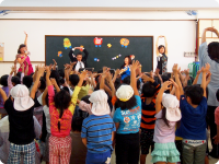 観客の皆さんと一緒に声を出す機会は以前より減ってしまいましたが、『だるまさんが』『でんしゃにのって』など大型絵本の読み語りやことば遊びなど、小さなお子さんからご年配の方まで楽しんでいただきました。