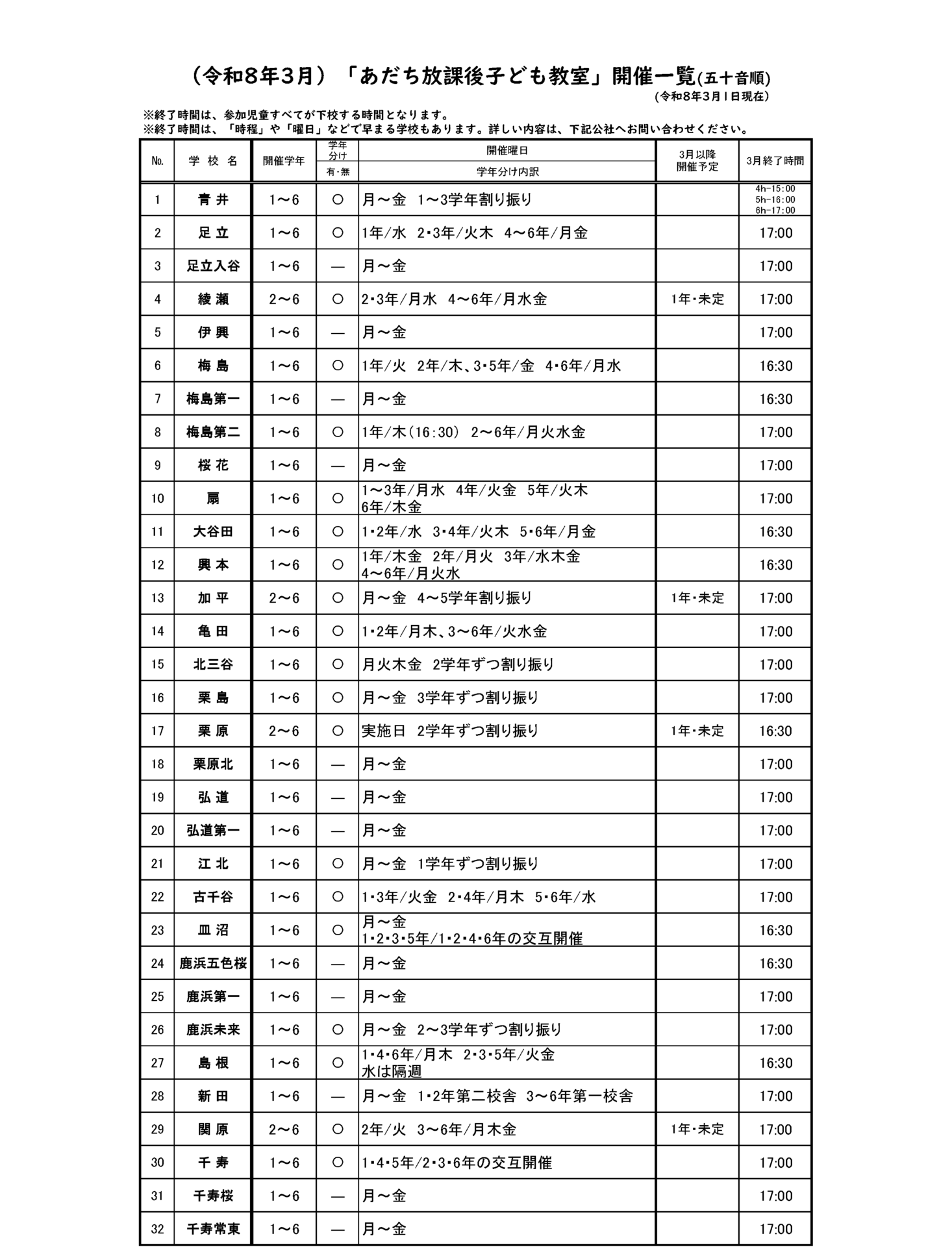 あだち放課後子ども教室の開催一覧です。(令和8年3月1日現在情報、五十音順)