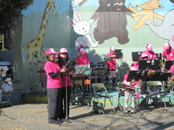 新西新井公園で開催された「第3回西新井多世代交流まつり」に足立ジュニア吹奏楽団が出演しました。会場には子どもからお年寄りまで多くの地域の方が集まり、出店でにぎわう中、ステージでは演歌からポップスまで幅広い楽曲を披露しました。